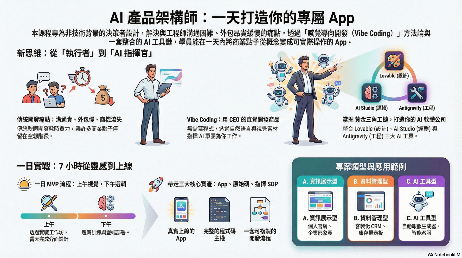 「這不是一堂程式設計課,這是一堂『數位生產力倍增』的經營管理課。帶走的不只是一個 App,而是一套能夠反覆變現的 AI 開發與指揮系統。」