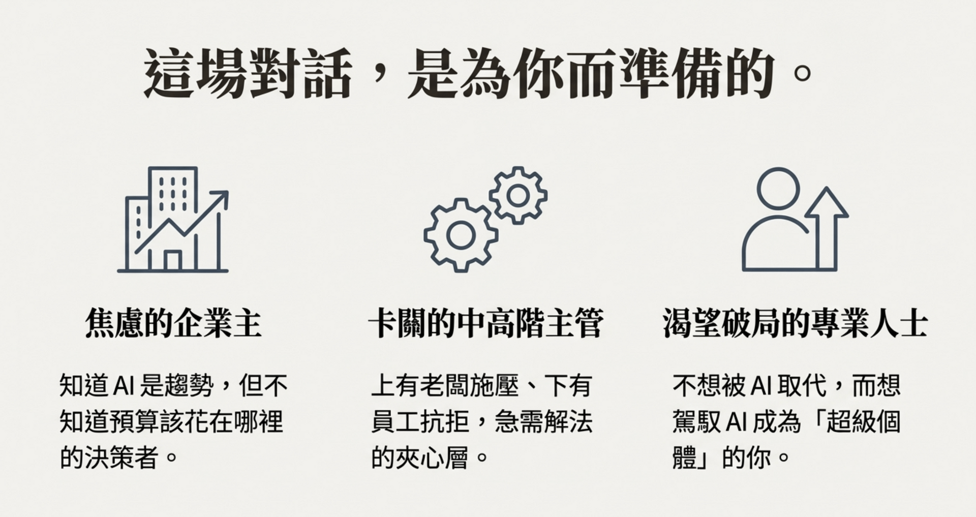 - 卡關的中高階主管: 上有老闆施壓、下有員工抗拒,急需解法的夾心層。