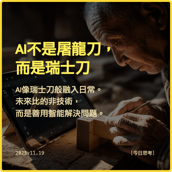 這對我們每個人來說,既是挑戰,也是巨大的機會。挑戰在於,過去那種「我學會一個軟體就能領先一步」的時代結束了。機會在於,當AI成為基礎設施時,創新的門檻其實被大大降低了。你不需要成為AI專家,你只需要成為一個善於利用基礎設施的「超級個體」。