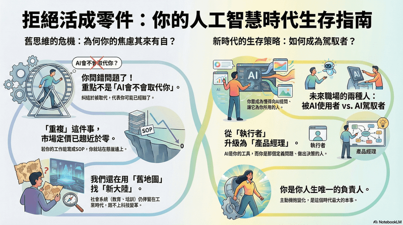 所以,不是 AI 很壞,而是「重複」這件事,在今天這個時代,它的市場定價歸零了。只要你敢把自己活成一個零件,AI 就敢把你拆下來換掉。